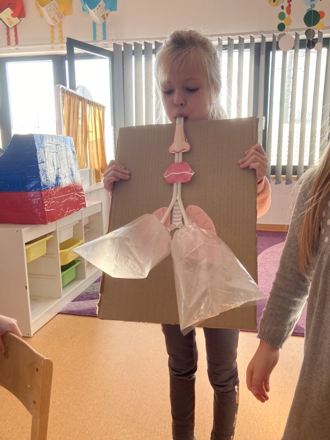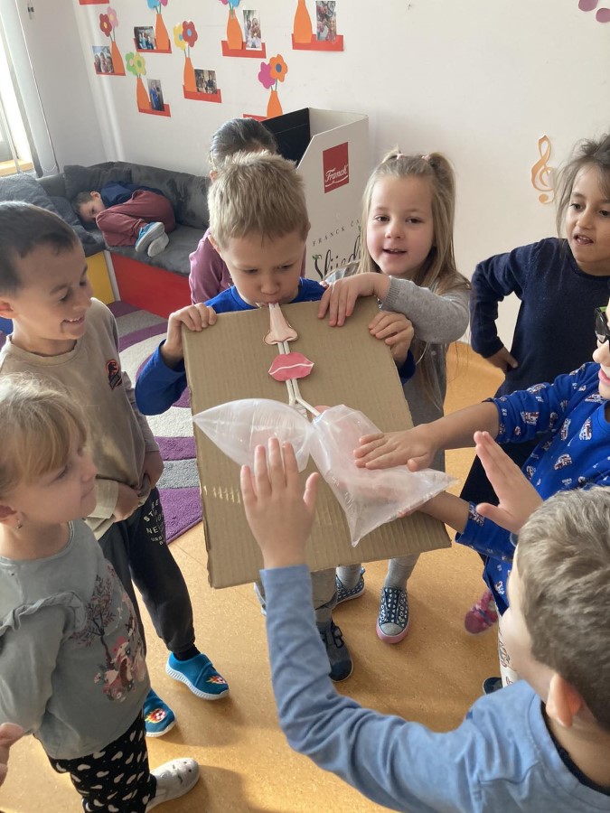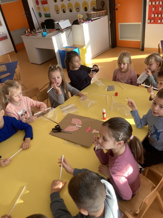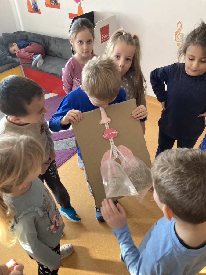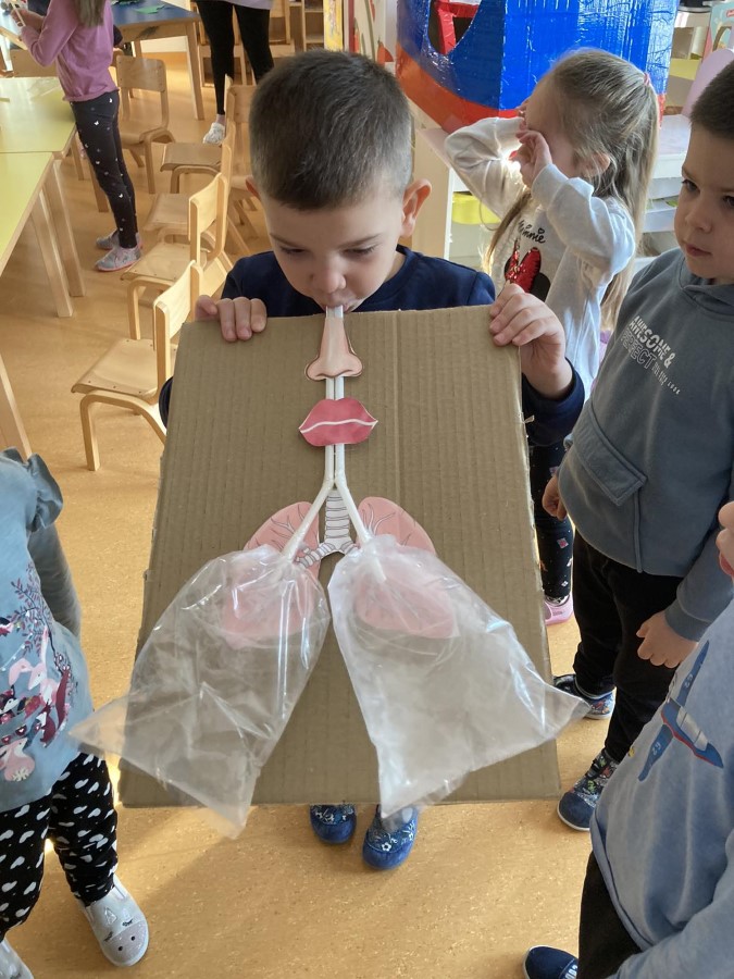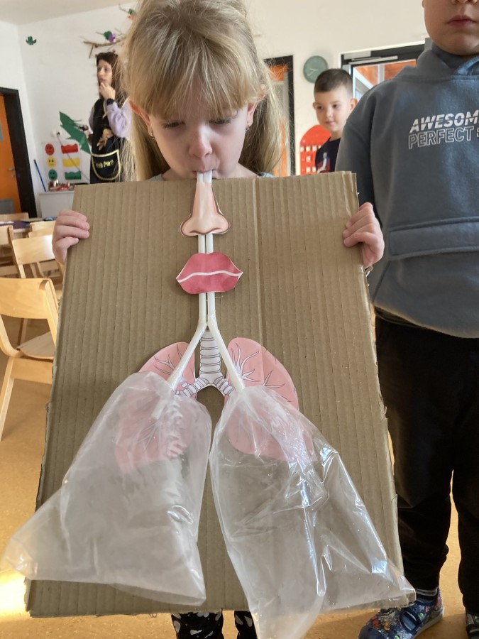 Dana 08.12.2023. djeca iz odgojne skupine „Pčelice“ uz pomoć zdravstvene voditeljice i odgojitelja, izradila su maketu dišnog sustava u svrhu edukacije i razumijevanja kako funkcionira ljudsko tijelo. Maketa prikazuje dišni sustav. Naučili smo od čega se sastoji dišni sustav, zašto je važno pravilno disati, čemu služi nos, usna šupljina, dušnik, dušnice i pluća. Djeca su pokazala velik interes za prikaz funkcije pluća pomoću makete te su naučili da strujanjem kroz nosne šupljine zrak se u sluznici pročišćava od prašine te se vlaži i zagrijava do uobičajene tjelesne temperature te da disanje na usta može uzrokovati upalu grla.