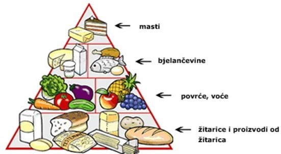 Glavne skupine namirnica poredane po zastupljenosti sadržane u piramidi su: